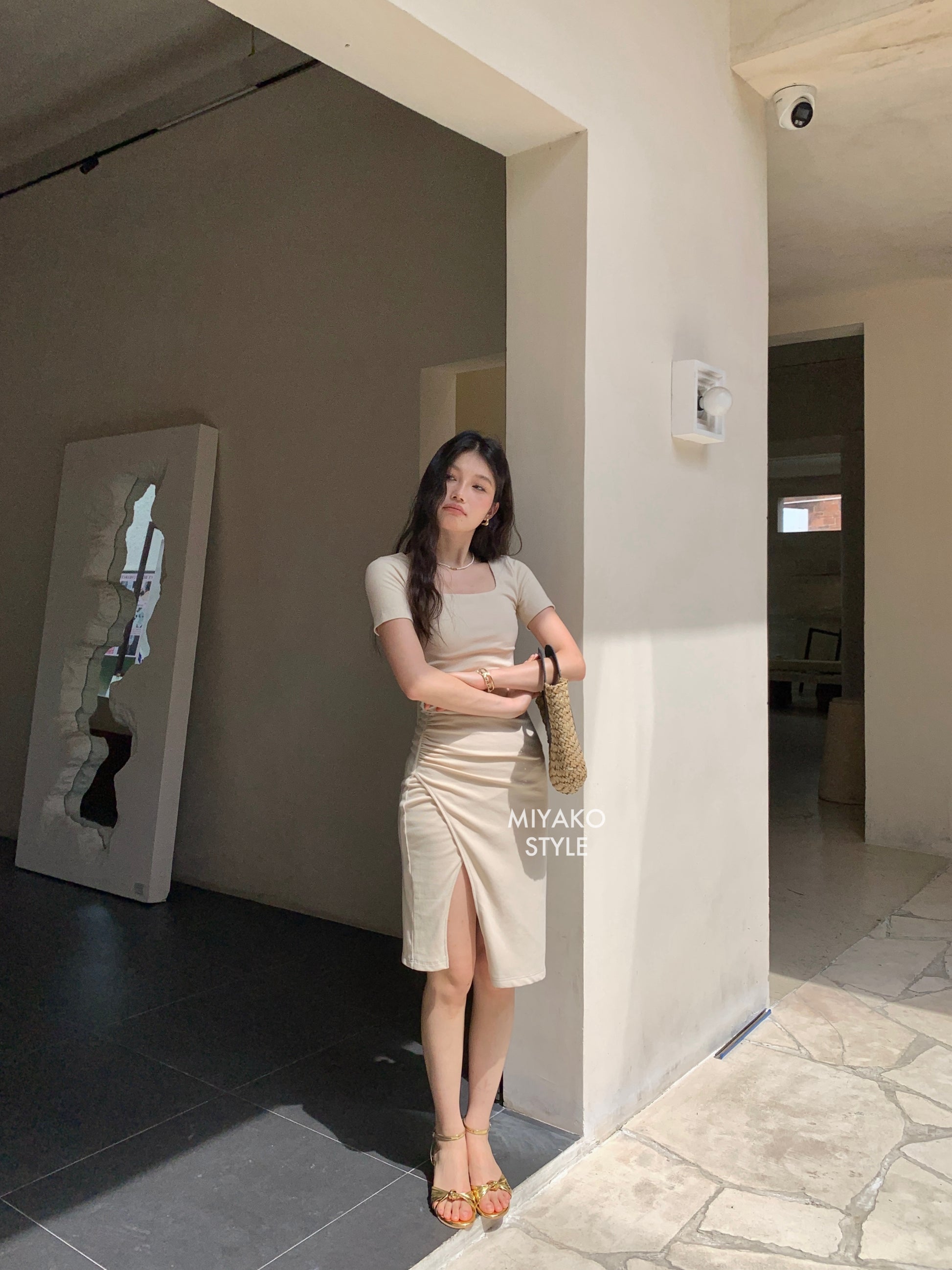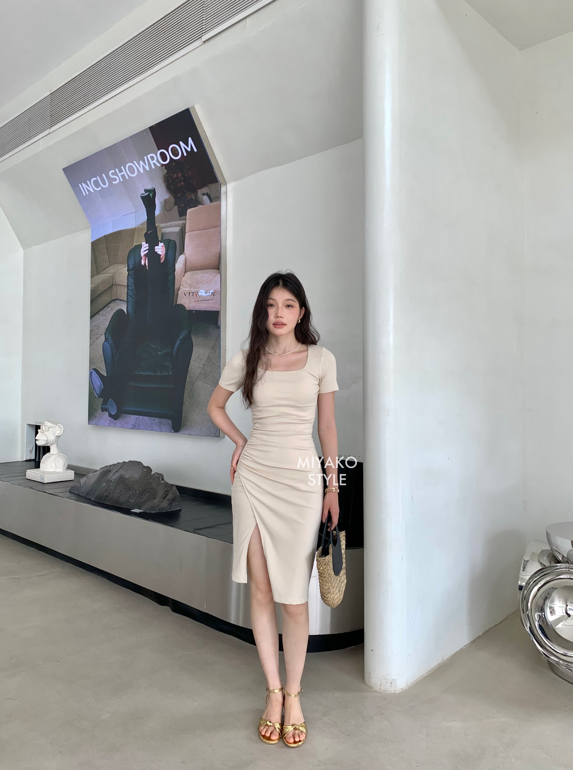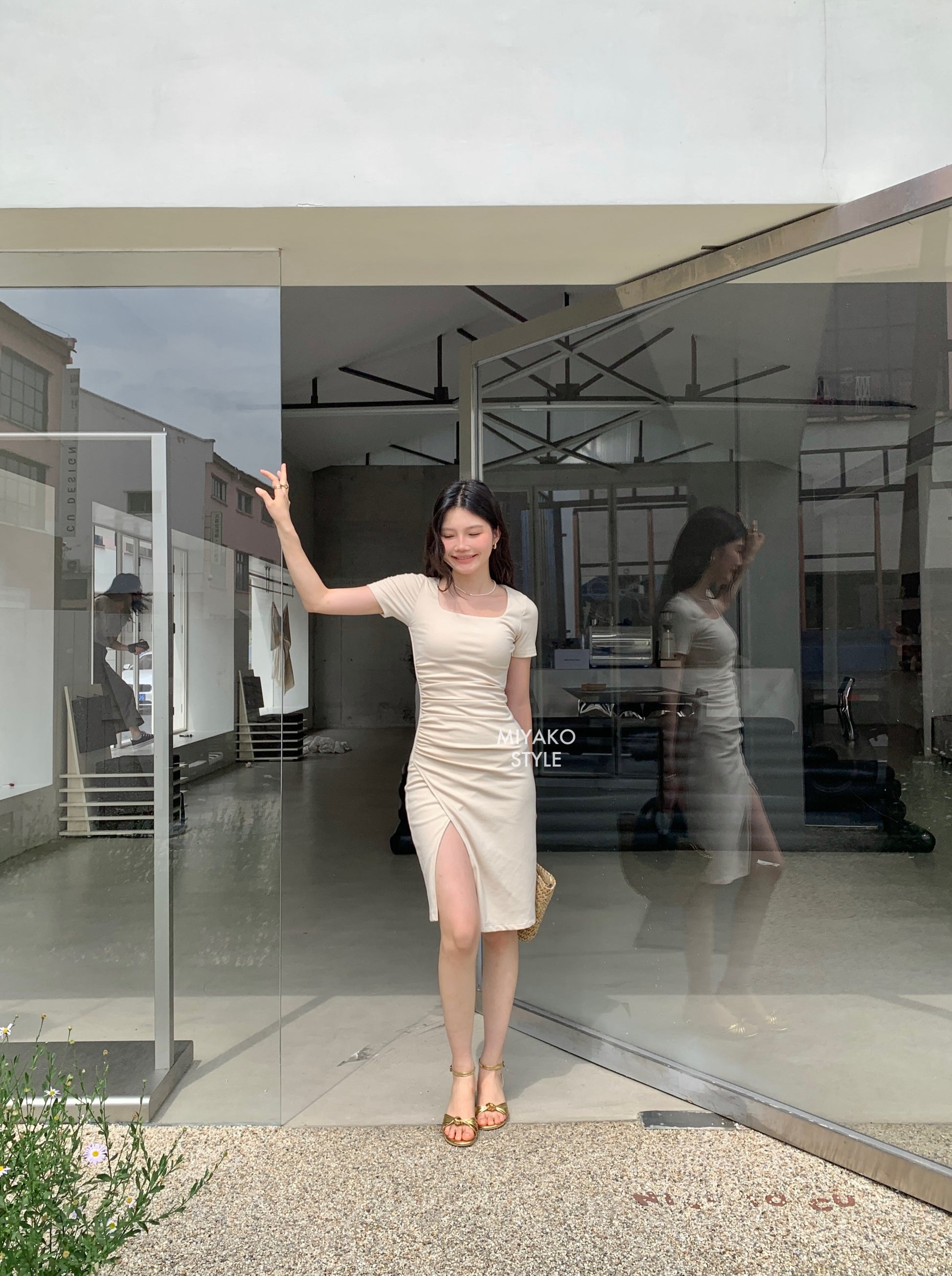 Valentina Short Sleeve Split Dress in Beige